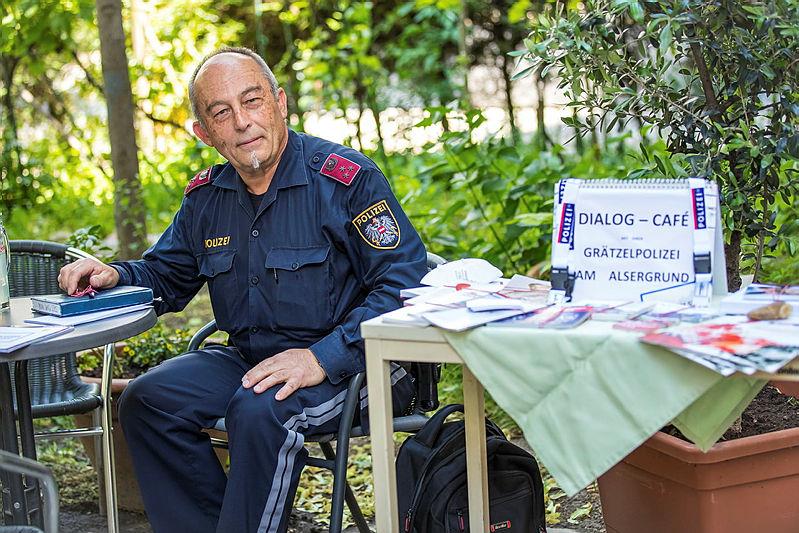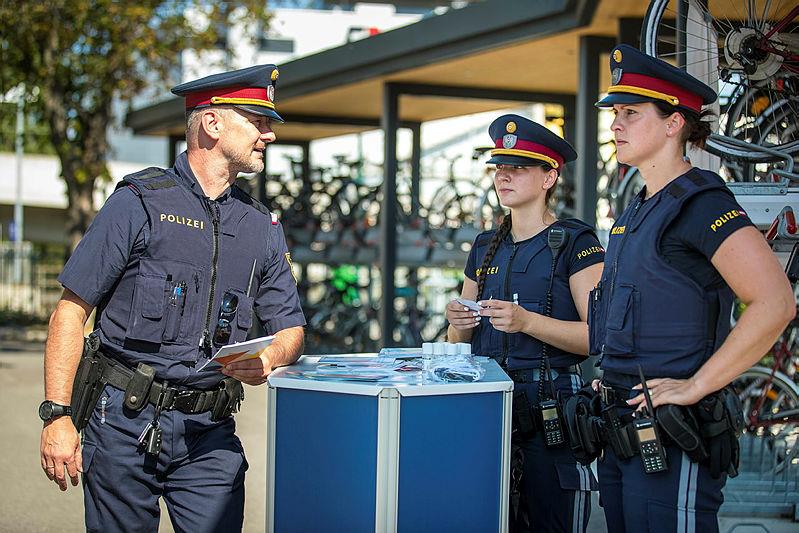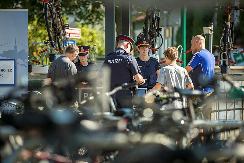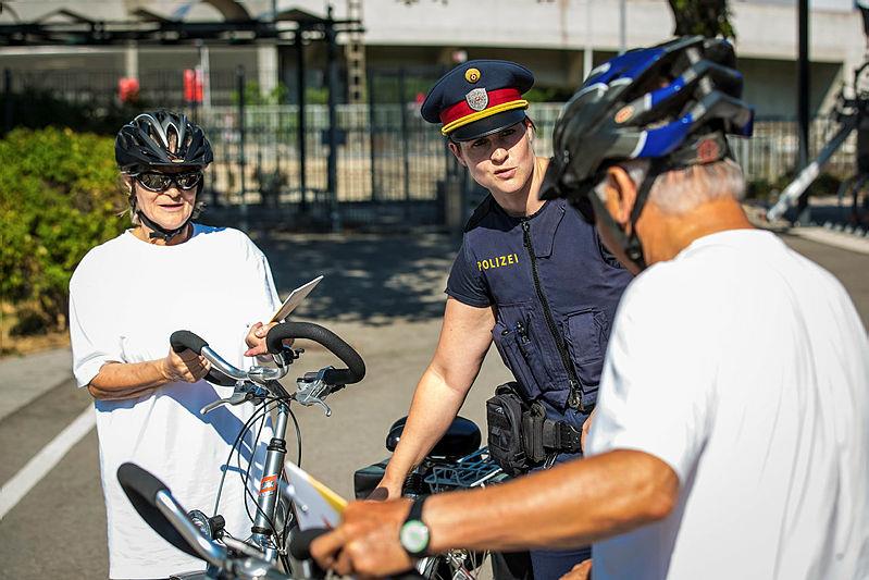 Ein junger Mann nähert sich, begrüßt Marion Seidl, die Präventionsbeamtin. Man kennt sich von Amtshandlungen. Seidl ist seit 16 Jahren in der Polizeiinspektion, kennt viele Gesichter. Sie mache Prävention, Verkehrserziehung, Kinderpolizei, Cyber-Kids, Jugendprävention in Schulen und Eigentumsprävention, sagt sie. Am vor ihr aufgestellten Pult liegen Broschüren: "Fakten &Tipps zum Schutz Ihres Fahrrades", "Richtig ausgerüstet", "Radfahren im besten Alter", "Kleine Radprofis". Auch Fahrradpässe – der junge Mann greift nach einem. Ein älterer Radfahrer beklagt sich bei Vogel – da geht es um Fragen, die nicht nur den Schutz des Fahrrades betreffen. Aber auch das gehöre dazu, betont der Polizist, der Vollblut-Polizist. Dessen Vater Rayonsinspektor in Wien war.